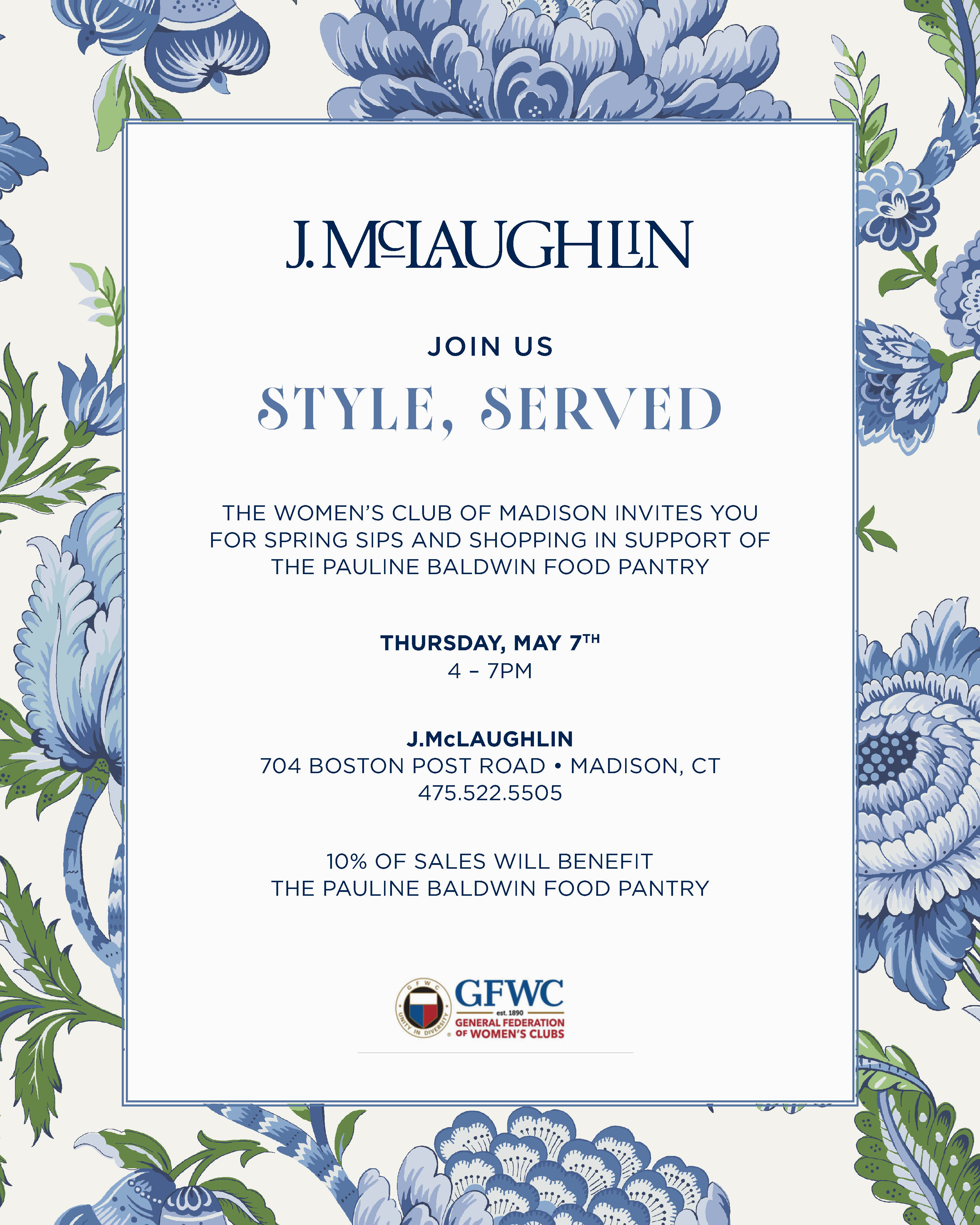 Style, Served. Join us for Spring Sips and Shopping. 10% of all sales will be donated to the Pauline Baldwin Food Pantry in Madison.